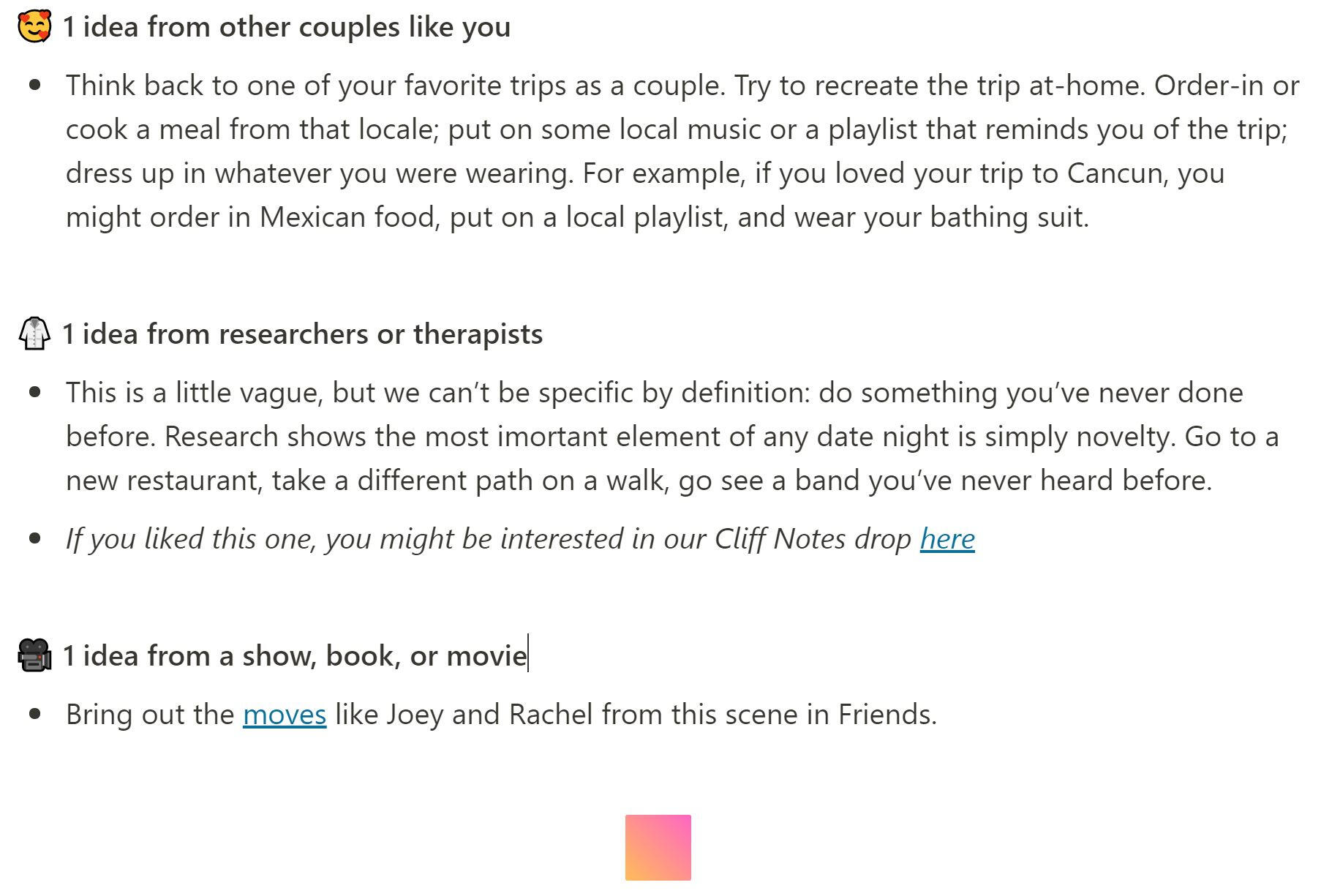 You can also check out our Date Night product here. We send out 3 date ideas every week (one inspired by research, one by other couples, and one by a movie or show).